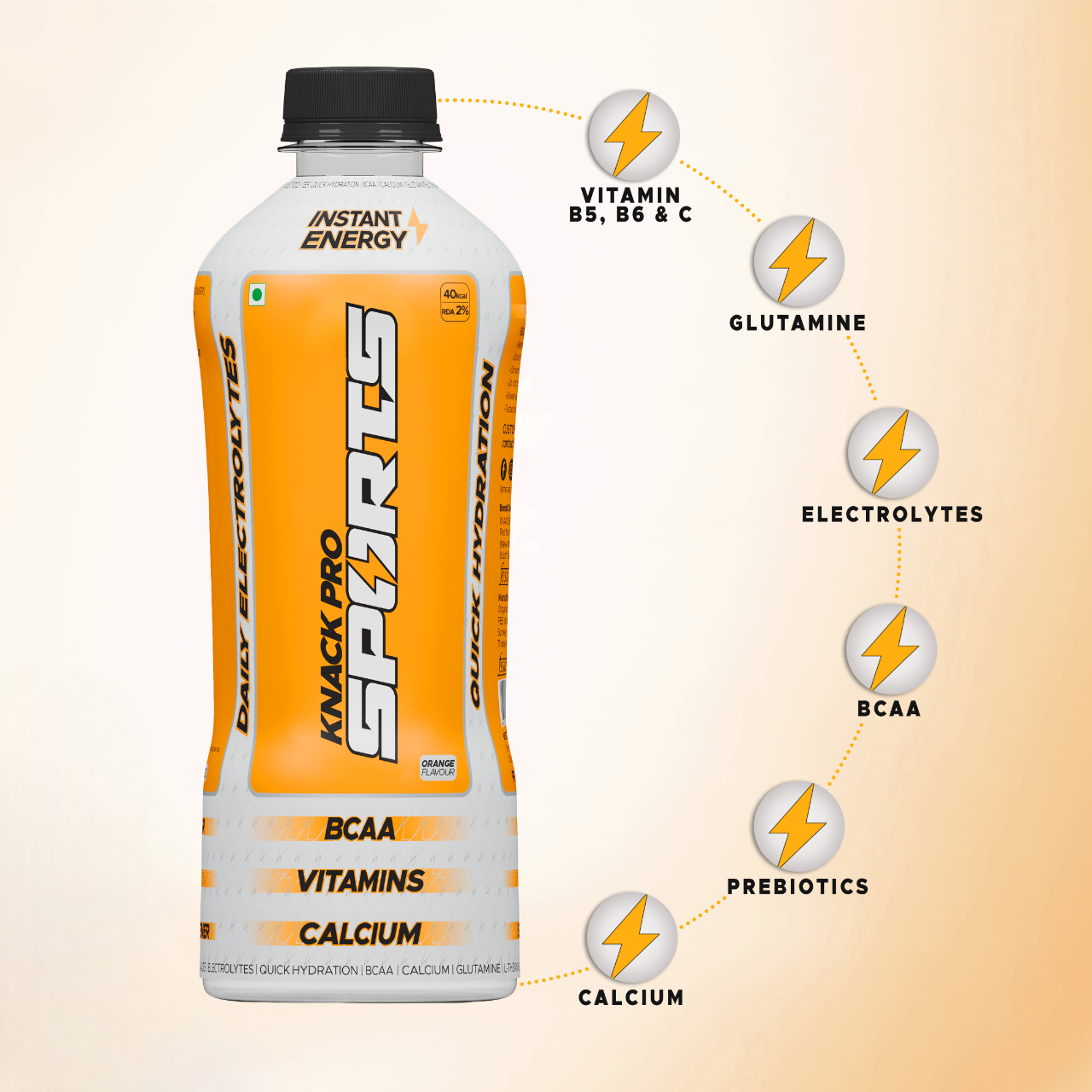 Knack Pro Sports (Orange Flavor): Quick Hydration with Essential Salts and Minerals Knack Pro Sports is one of its kind formulations which not only hydrates your body but helps in recovery as well. As compared to other hydration drinks, Knack pro Sport is infused with BCAA, Glutamine, Multi-Vitamins & Prebiotics which helps in quick recovery & takes care of your gut. As new India is rising, our goal is to build a community, elevate hydration standards, and spread awareness. This is why we call it "Hydration Naye Bharat Ka."